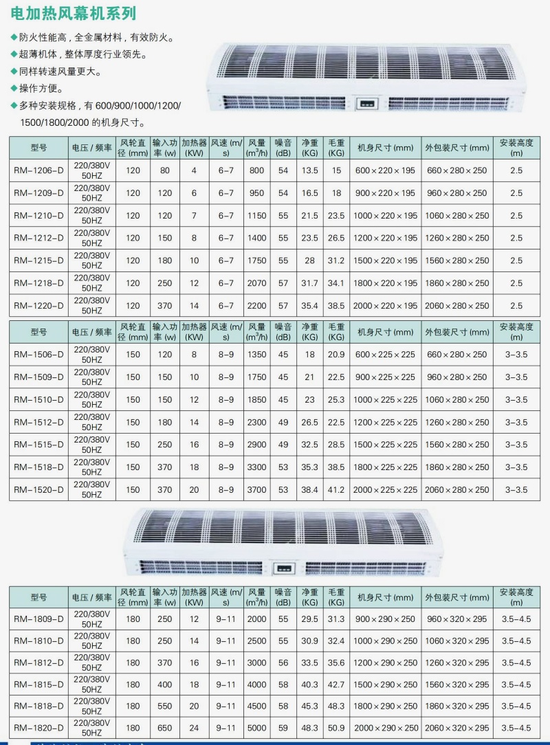 贯流电热风幕机,采用贯流式风轮。风量两档设计。PTC加热,可选配遥控开关。